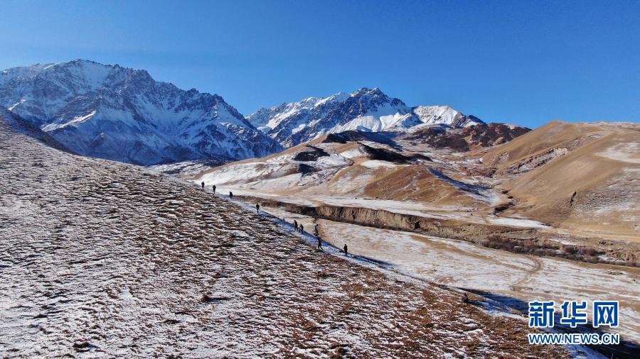 12月8日,祁連山國家公園扎麻什管護(hù)站生態(tài)管護(hù)員在巡護(hù)途中(無人機(jī)照片)。新華社記者 張宏祥 攝