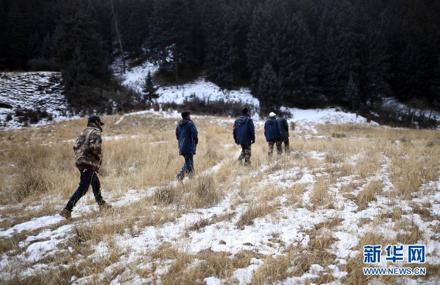 12月8日,祁連山國家公園扎麻什管護(hù)站生態(tài)管護(hù)員昂旦才讓(右一)和同伴們在巡護(hù)途中。新華社記者 張宏祥 攝