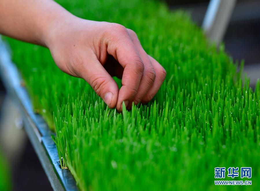 1月13日,在青海省果洛藏族自治州農(nóng)牧業(yè)生態(tài)科技示范園,工作人員在查看牧草生長(zhǎng)情況。 新華社記者 張龍 攝