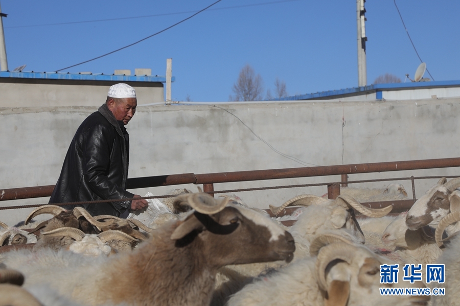 青海省海南藏族自治州共和縣興隆肉羊養(yǎng)殖專(zhuān)業(yè)合作社負(fù)責(zé)人馬生海在喂羊(1月28日攝)。新華社記者 趙玉和 攝