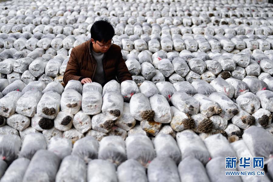 3月14日,在青海省果洛藏族自治州農(nóng)牧業(yè)生態(tài)科技示范園內,農(nóng)業(yè)技術員宋建東在查看平菇生長情況。新華社記者 張龍 攝