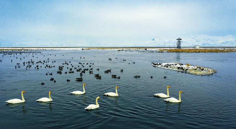 3月6日,若爾蓋濕地國家級自然保護區(qū)在花湖設(shè)立的高科技無人觀測塔(右后)正全天候觀察濕地鳥類的活動。尹鋼 攝