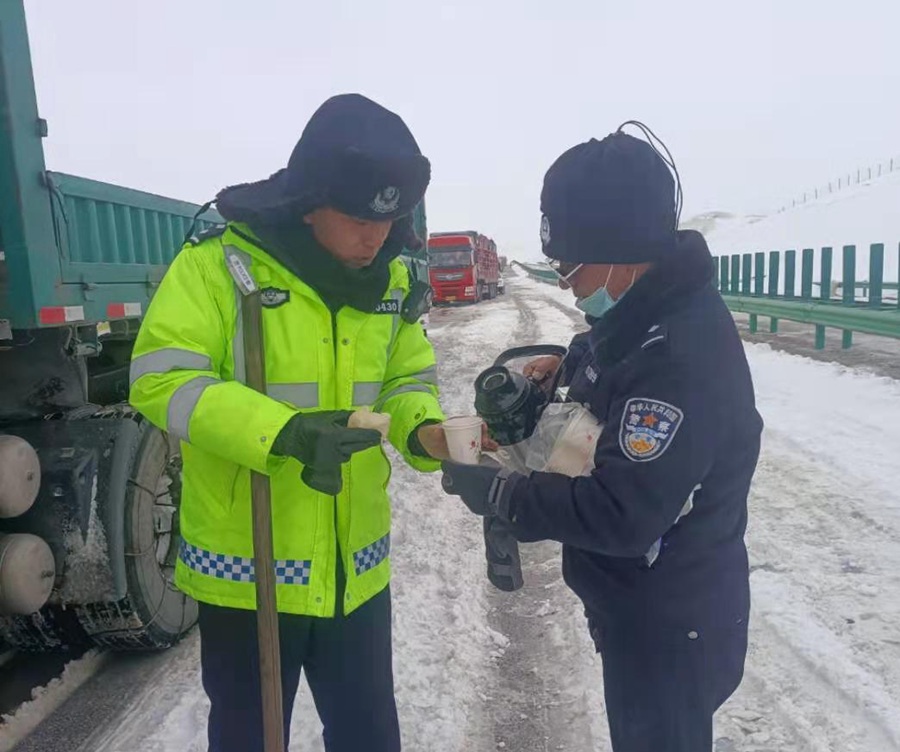 李西和同事們紛紛拿起鐵鍬將積雪鏟至道路兩邊,迅速開(kāi)辟出一條臨時(shí)車(chē)道,讓車(chē)輛緩慢通行,這時(shí)他們已經(jīng)連續(xù)奮戰(zhàn)7個(gè)多小時(shí)。民警吃的是溫水泡的方便面,渴了就喝冰涼的礦泉水,或者直接抓一把雪塞到嘴里。累的實(shí)在不行就隨便找個(gè)能擋風(fēng)的地方睡一會(huì)。有時(shí)候遇到堵車(chē),有些司乘人員沒(méi)有帶食物,大家還把自己的口糧分給他們,他們只能挨著餓。