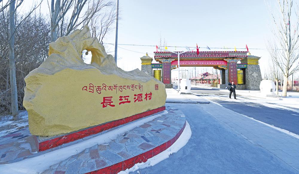 從格爾木市區(qū)沿109國道一路向南,車子行駛在廣闊平坦的公路上,窗外的景色緩緩退后。忽然間,路旁一塊刻有“長江源村”字樣的巨石撲入眼簾,像一面破浪前行的風帆,亦像一座拔地而起的豐碑,與一旁極具藏民族特色的大門交相輝映。站在村口放眼望去,一排排藏式風格的庭院錯落有致,屋頂上一面面五星紅旗獵獵招展,將湛藍的天空映襯得分外純凈。