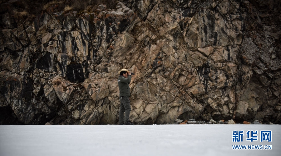 4月23日,祁連山國家公園沙龍灘管護(hù)站生態(tài)管護(hù)員羅藏次成在巡護(hù)途中使用望遠(yuǎn)鏡監(jiān)測野生動(dòng)物。新華社記者 吳剛 攝
