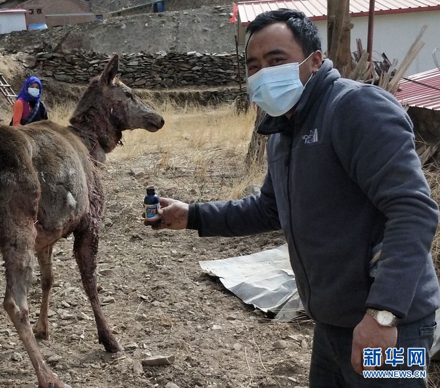圖為護林員給救助的馬鹿上藥。(圖片由瑪沁縣東傾溝鄉(xiāng)政府提供)