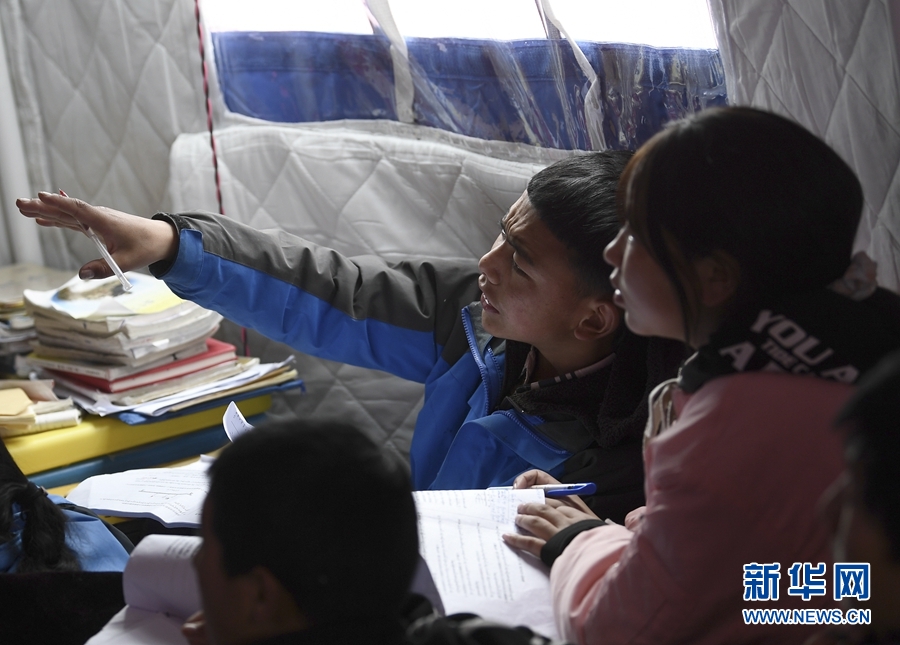 5月23日,瑪多縣民族寄宿制中學(xué)九年級(jí)老師李加才仁在課堂上輔導(dǎo)學(xué)生。新華社記者 張龍 攝