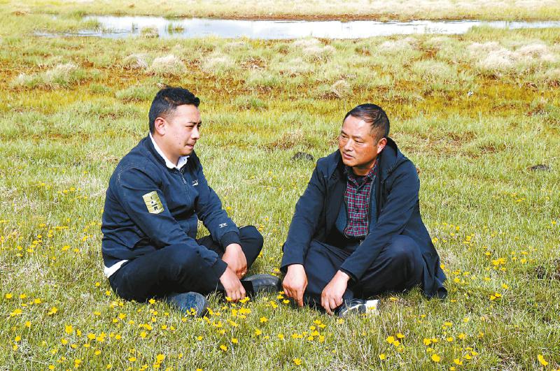 若爾蓋縣科學(xué)技術(shù)和農(nóng)業(yè)畜牧局局長(zhǎng)張建榮(右)與牧民交流。四川日?qǐng)?bào)全媒體記者 徐登林 攝
