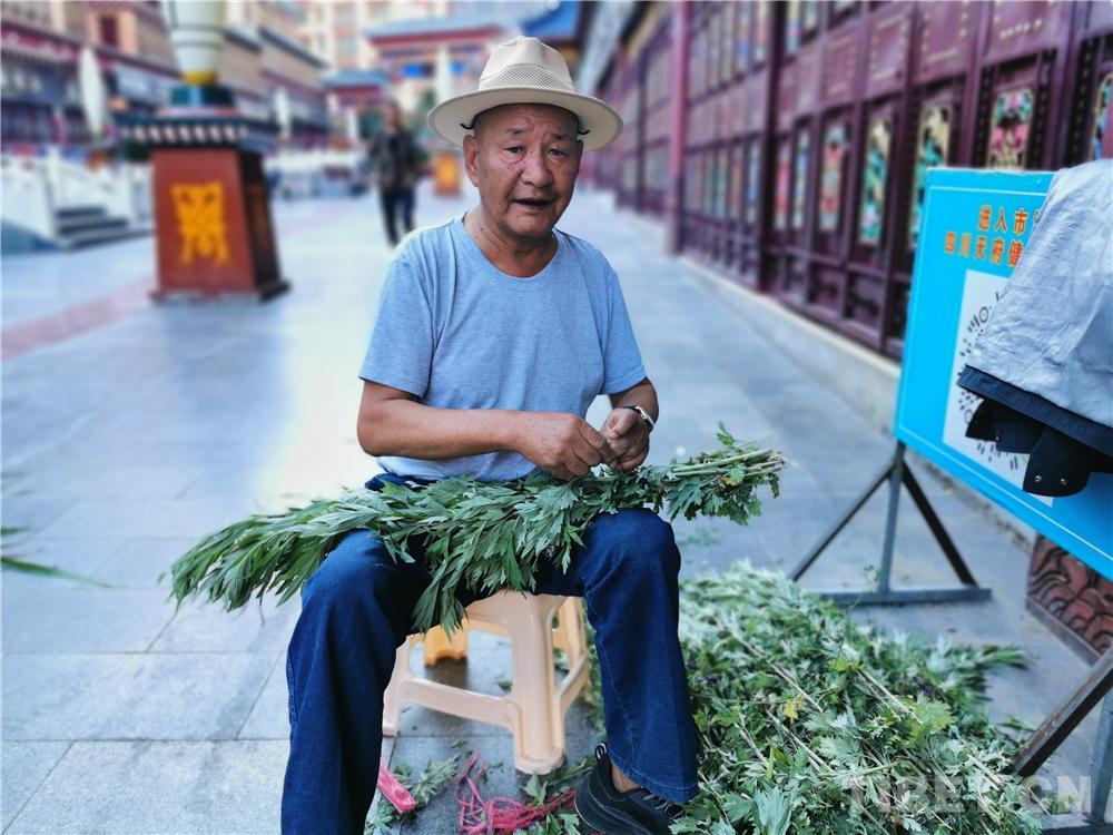 圖為藏族大叔在攤位上打包艾葉