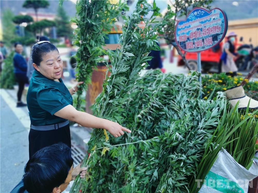 圖為藏族婦女在攤位上打包艾葉