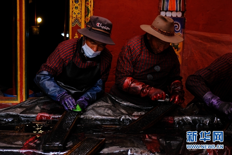 藏族雕版印刷非遺傳承人在校對木刻版。新華網 張可凡 攝