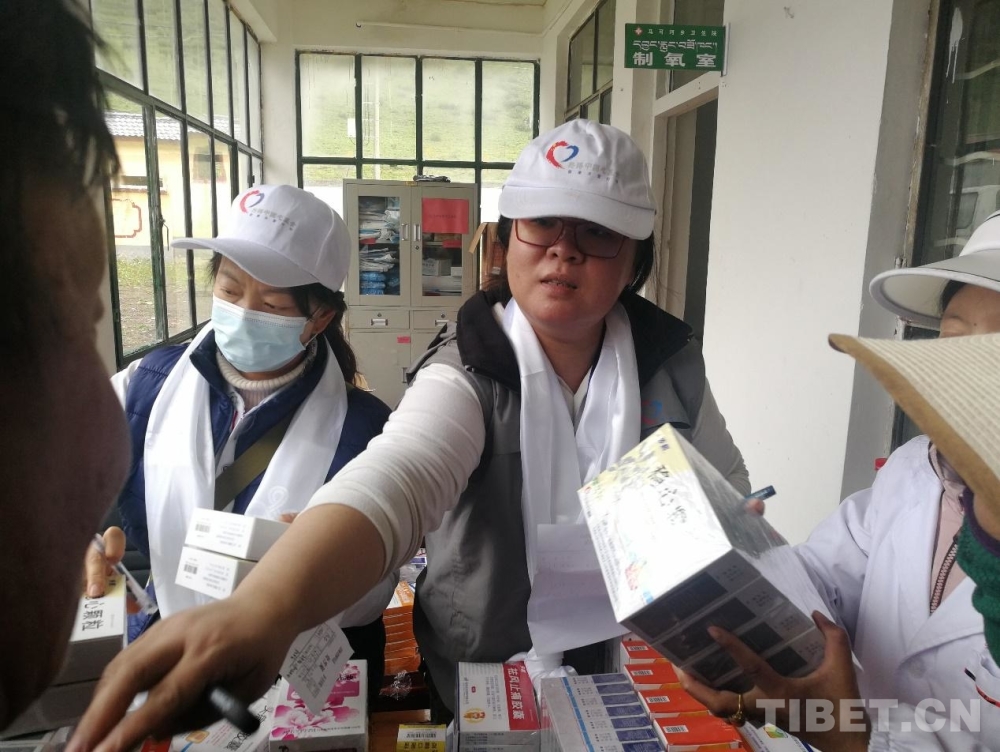 圖為陳思音(右)在果洛州義診時為當(dāng)?shù)厝罕姺职l(fā)藥品