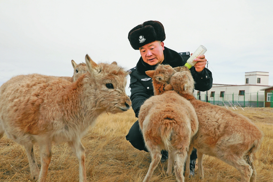 索南達杰保護站站長趙新錄在給藏羚羊幼仔喂奶。新華社發(fā)