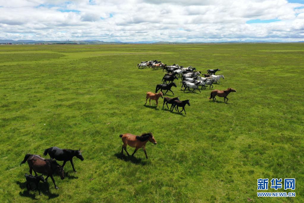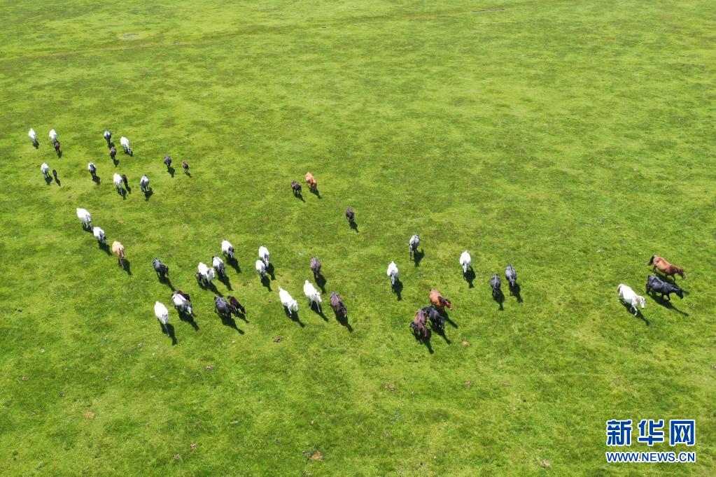 這是7月15日在甘肅瑪曲縣河曲馬場拍攝的河曲馬(無人機(jī)照片)。 新華社記者 杜哲宇 攝