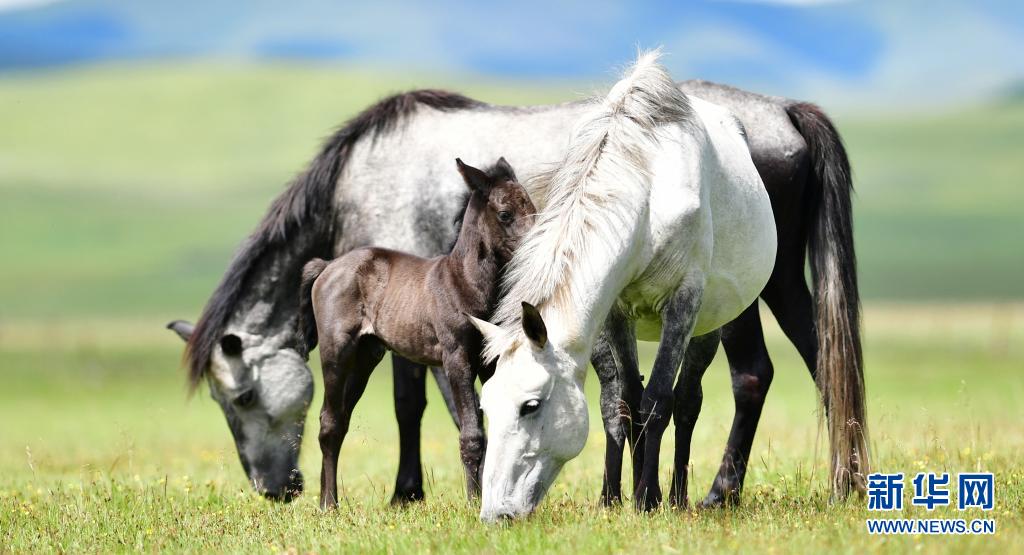 這是7月15日在甘肅瑪曲縣河曲馬場拍攝的河曲馬。新華社記者 杜哲宇 攝
