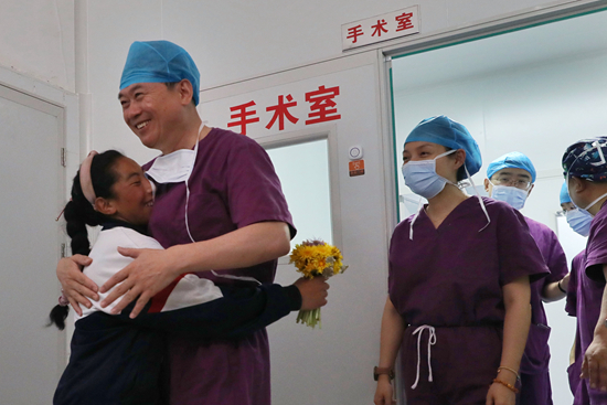 當做完14臺手術的中國工程院院士、北京清華長庚醫(yī)院院長董家鴻從手術室走出來,旦正措趕緊上前,與董爺爺擁抱。