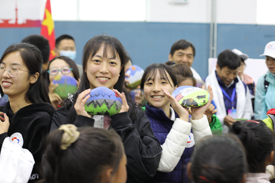 活動現(xiàn)場,福利學校的孩子們將親手制作的石頭畫送給成長營的小老師們。受訪者供圖
