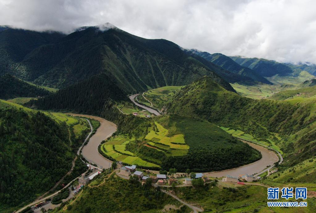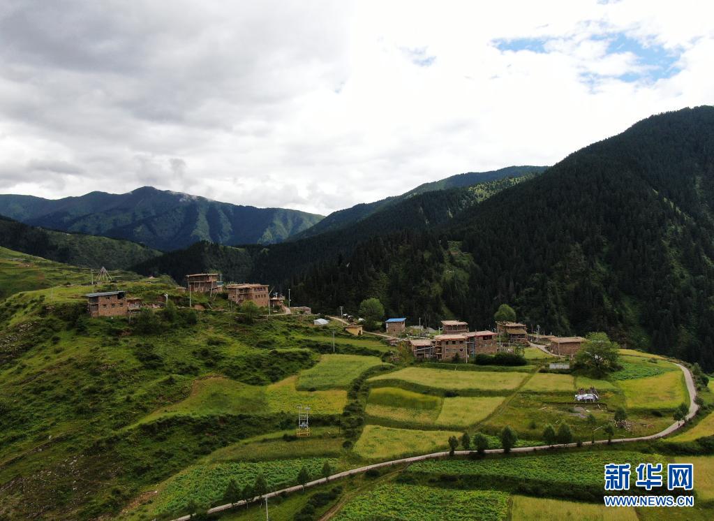 8月7日在青海省果洛藏族自治州班瑪縣境內(nèi)拍攝的村莊景色(無人機(jī)照片)。新華社記者 張龍 攝