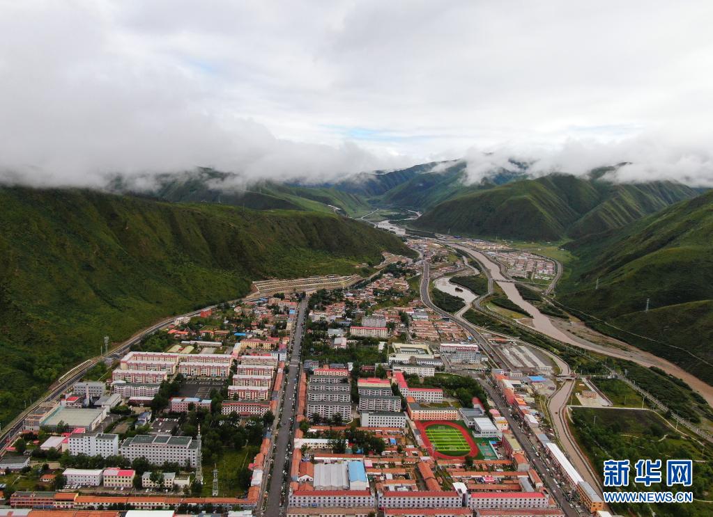 8月8日在青海省果洛藏族自治州班瑪縣境內(nèi)拍攝的縣城景色(無人機(jī)照片)。新華社記者 張龍 攝
