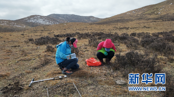 郭娜(右)和同學(xué)在進行春季牧場的植被調(diào)查。(受訪者供圖)