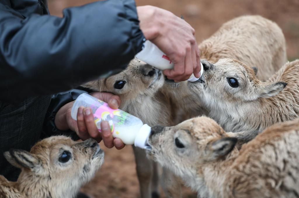 2020年7月7日,三江源國家公園管理局長(zhǎng)江源園區(qū)可可西里管理處卓乃湖保護(hù)站的工作人員才文多杰在給藏羚羊幼仔喂奶。新華社記者薛玉斌 攝