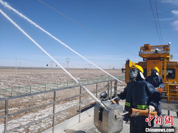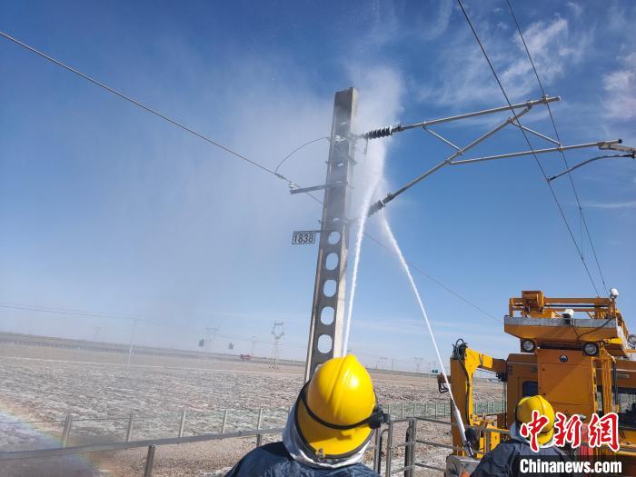 圖為接觸網(wǎng)清洗車在清洗鹽污區(qū)段的接觸網(wǎng)絕緣子。周賀 攝