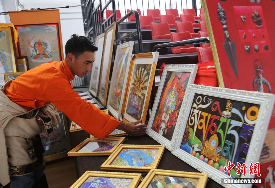 圖為畫(huà)師展示唐卡。張?zhí)砀?攝