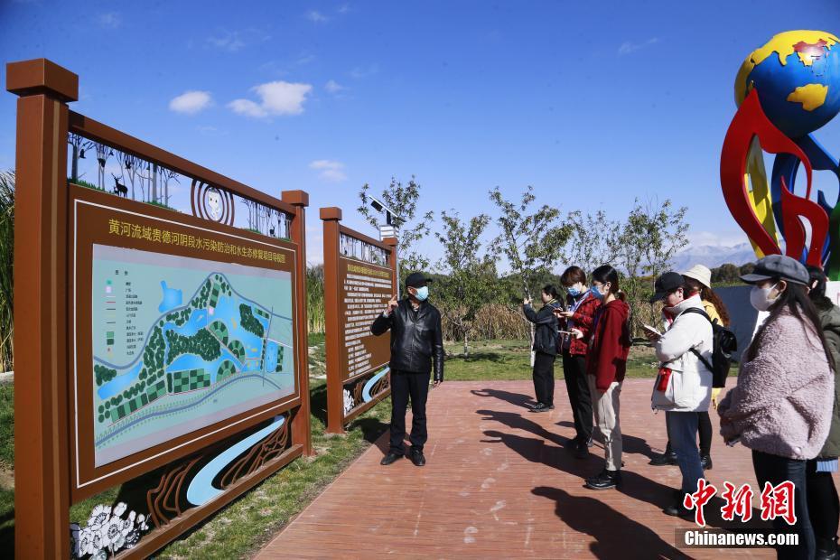 10月16日,青海省海南藏族自治州貴德縣蘆花灣水生態(tài)公園內(nèi),工作人員向記者們介紹該項目進(jìn)展與成效。 中新社記者 馬銘言 攝