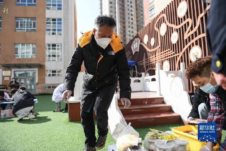 10月31日,羅宗周正在為西寧勝利路一社區(qū)核酸采樣點(diǎn)送愛(ài)心餐。新華社記者 吳剛 攝