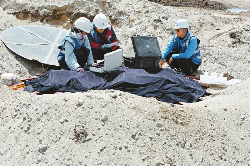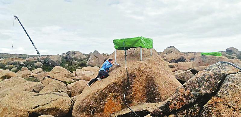 2020年5月15日,科研人員匍匐在巨石上安裝電磁粒子探測器。