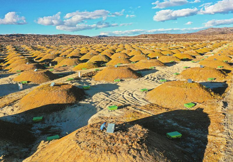 10月11日,放眼望去,觀測基地周邊均勻分布著壯觀的土堆,這就是繆子探測器。每個(gè)土堆大概有36平方米大小,土堆下是一個(gè)直徑6.8米、高1.2米的混凝土罐體,罐體中放置了裝有超純水的高反射率水袋。