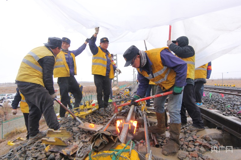 但這還不夠,為了讓鋼軌充分舒放“筋骨”、釋放應(yīng)力,職工們還必須切開鋼軌,緊接著進行焊聯(lián),這項工作由德令哈重點維修車間負責。車間主任郭鋒亮一邊組織職工開動切割機實施精準切割,一邊組織職工架起焊鍋?;鸹w舞,火苗竄升,作業(yè)人員的對比服在火光和風雪的映襯下顯得更加熠熠生輝。最終,做完“伸展運動”的鋼軌在焊劑的作用下重新融合在了一起,經(jīng)打磨后再難區(qū)分彼此。