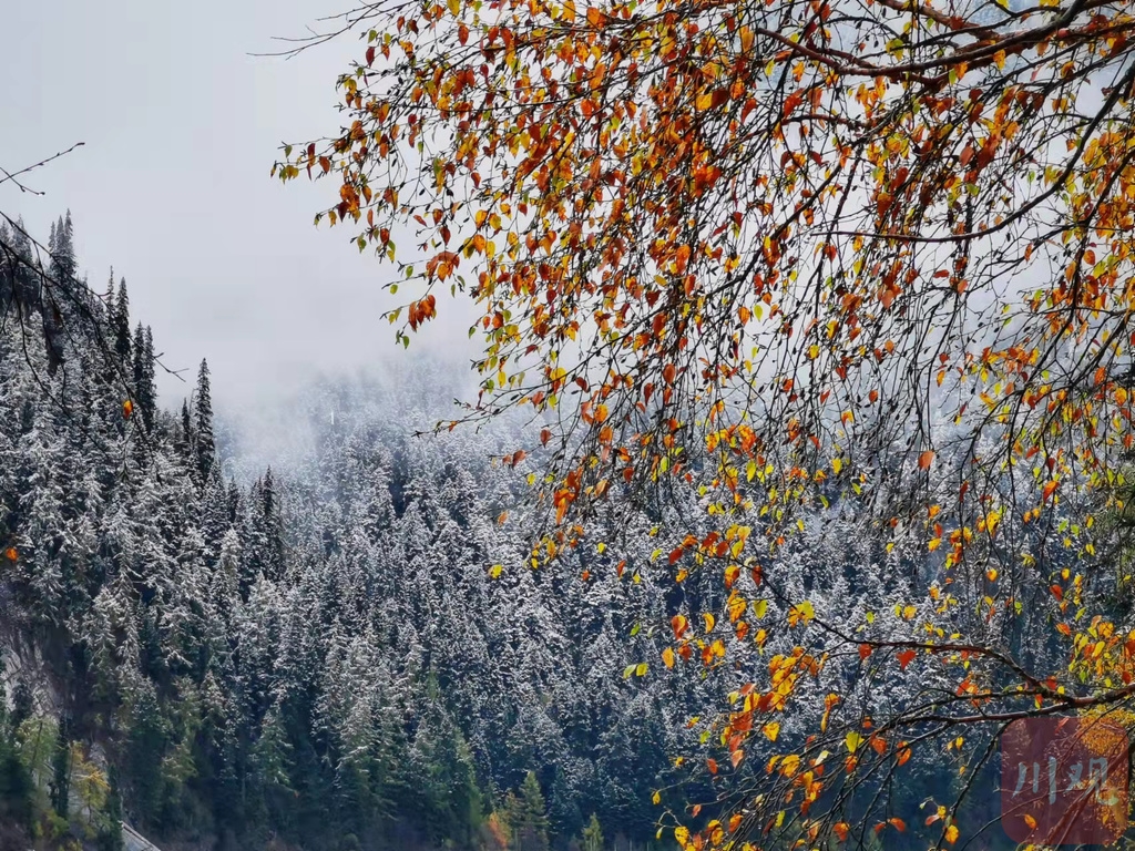 交替時節(jié),四川各地眼下已融合成了多姿多彩的天然調色盤,或是彩林錯落,或是銀裝素裹,彩林與白雪相遇相擁,半山彩林半山雪的景致讓人無限向往。