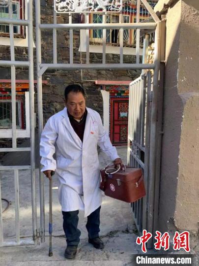 索木滾拄著拐杖出診?!∪捞量h委宣傳部供圖