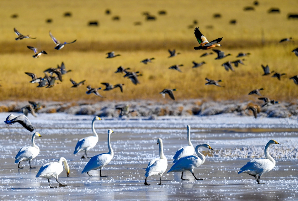 入冬以來,甘肅省甘南藏族自治州碌曲縣尕海濕地越冬的大天鵝浴雪歡歌,翩翩起舞,成為草原上一道獨(dú)特的風(fēng)景。