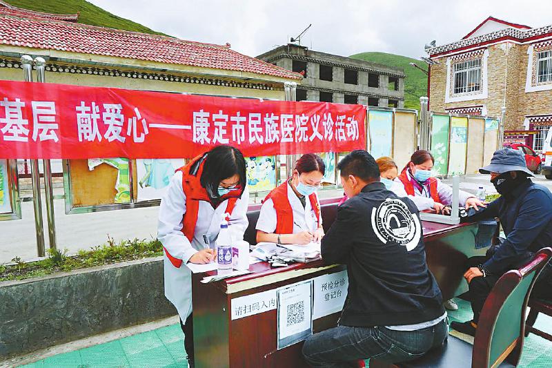 都江堰市第六批對口支援工作隊隊員、掛職康定市民族醫(yī)院副院長的田梅等醫(yī)生在新都橋鎮(zhèn)開展義診活動。