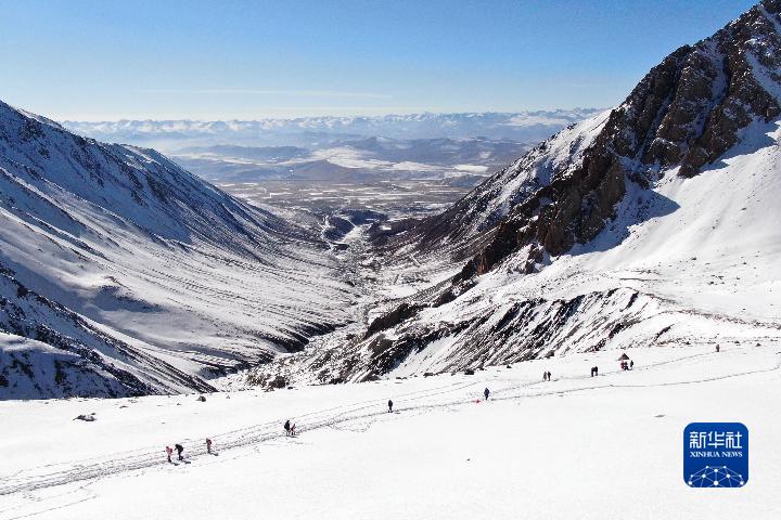 1月1日,登山愛好者攀登崗什卡雪峰(無人機(jī)照片)。