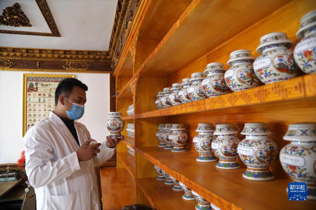 1月27日,在青海省海南藏族自治州貴德縣常牧鎮(zhèn)中心衛(wèi)生院藏醫(yī)館,醫(yī)生為患者取藏藥。新華社記者 央秀達珍 攝