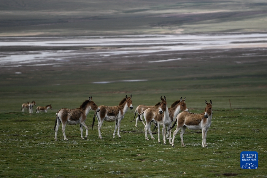 在三江源地區(qū),一群藏野驢在草原上活動(dòng)(2021年7月25日攝)。新華社記者 張龍 攝