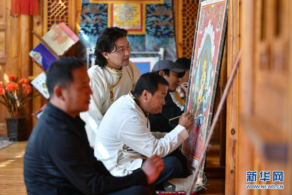 為了更好地傳承和發(fā)揚(yáng)熱貢唐卡繪畫技藝,格桑嘉措又相繼拜多名唐卡大師為師,虛心接受指導(dǎo),刻苦練習(xí)唐卡技藝,將大師們高超的繪畫技藝與家傳技藝融會(huì)貫通,使得他的繪畫功底得到了很大的提升。圖為格桑嘉措在繪制唐卡作品。