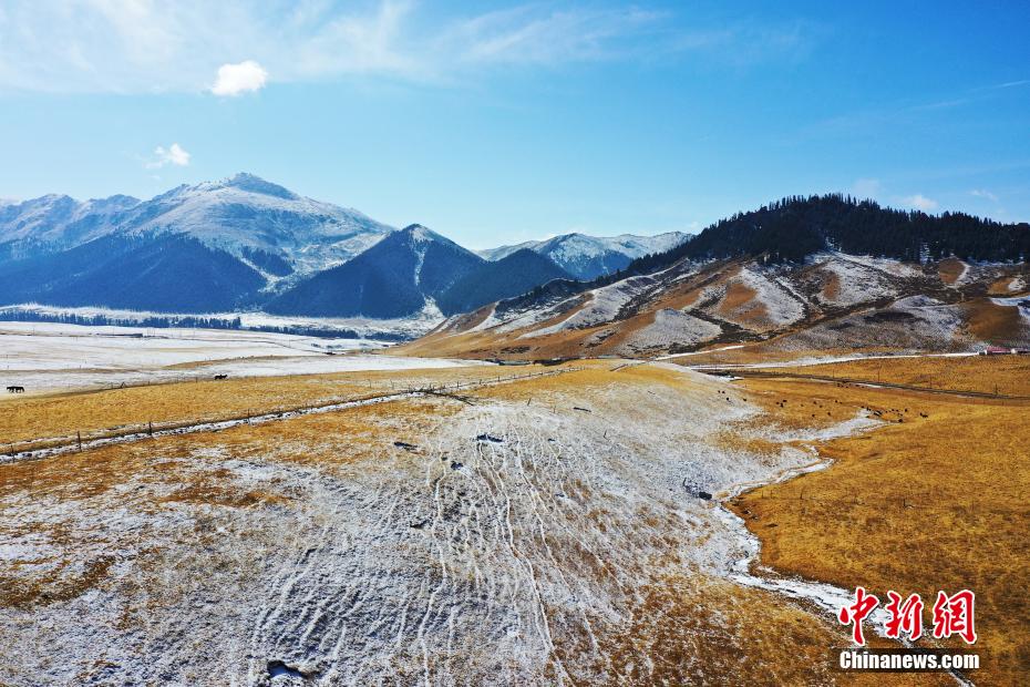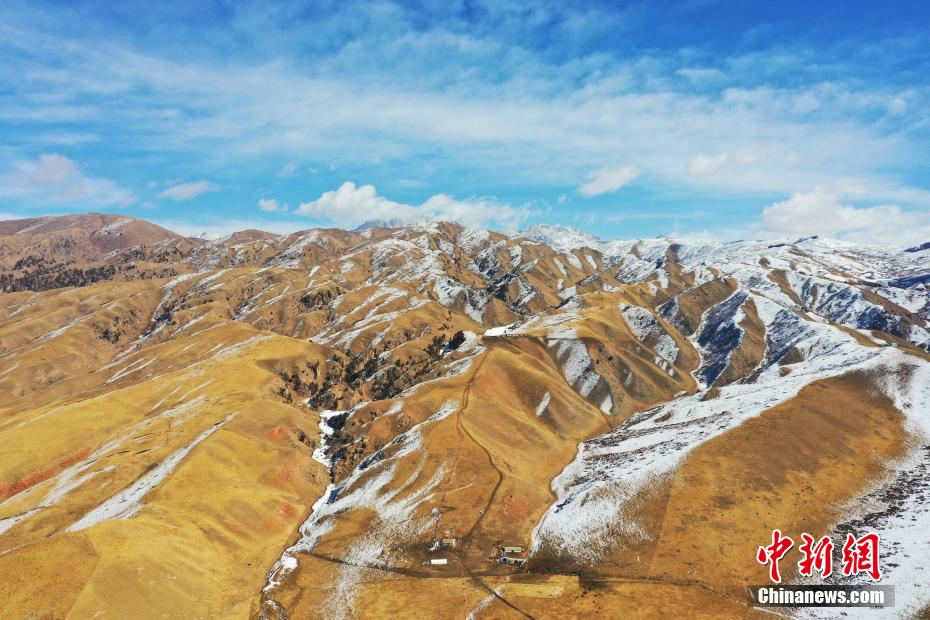 一場春雪過后,青海省海北藏族自治州祁連山國家公園青海片區(qū)群山被白雪覆蓋,云霧繚繞,金色的草場、潔白的羊群和蔚藍(lán)的天空相映成趣,美不勝收。馬銘言 攝