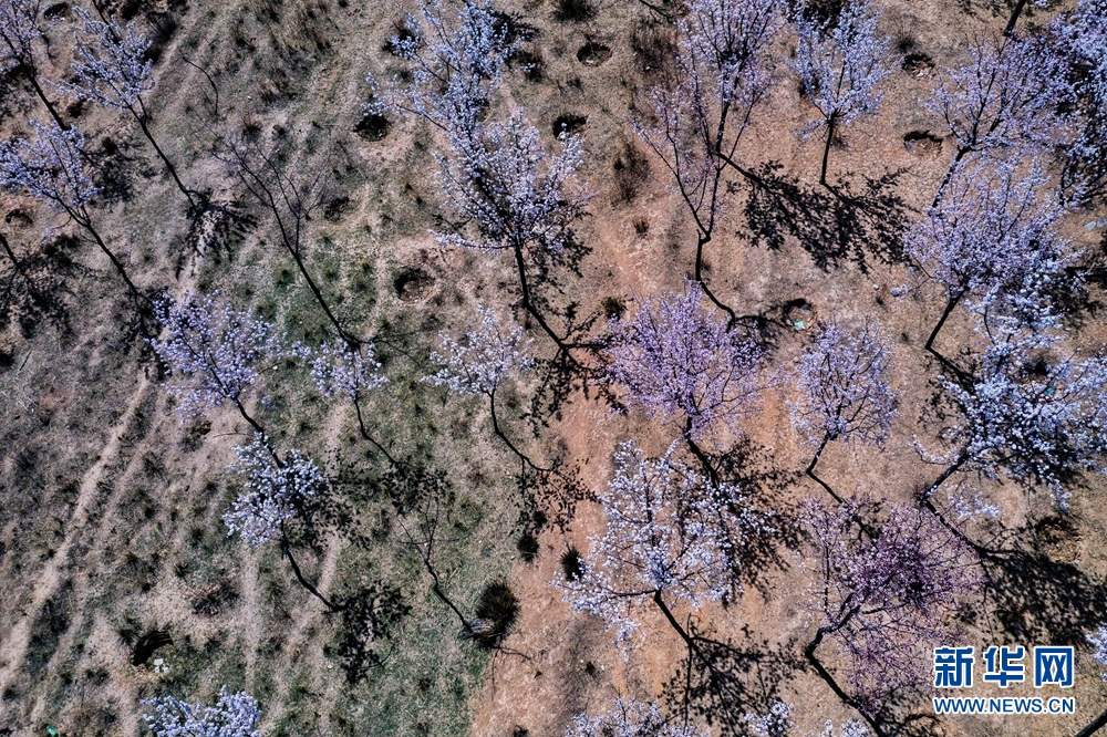 盛開的梨花與斑駁的樹影,形成一道別致的風景線。新華網(wǎng) 宋忠勇 攝