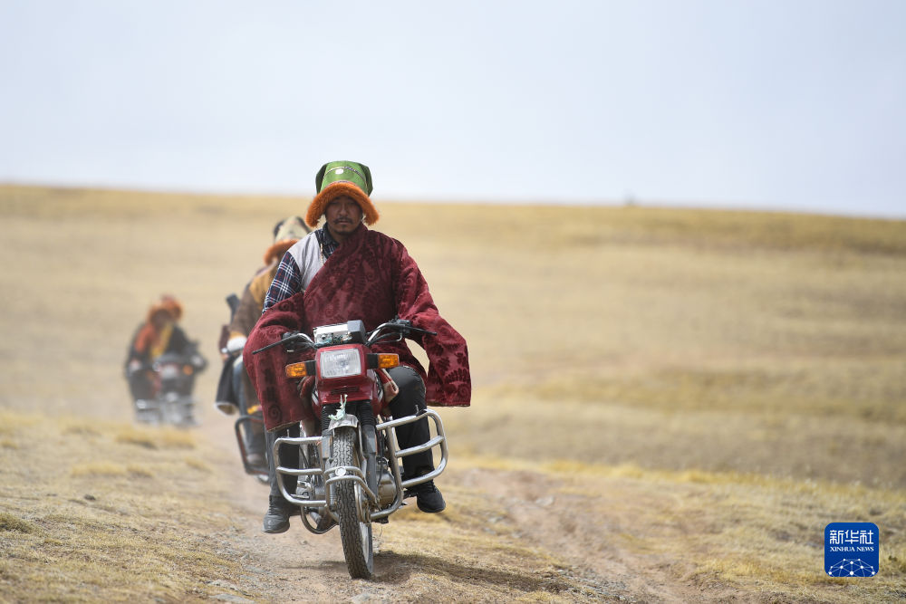 4月21日,在青海省玉樹藏族自治州曲麻萊縣麻多鄉(xiāng)約古宗列曲附近,生態(tài)管護員才仁扎西駕駛摩托車巡護。新華社記者 張龍 攝