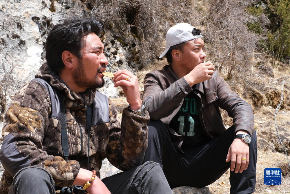 4月22日,生態(tài)管護員達杰(左)和尕次在休息。新華社記者 韓方方 攝