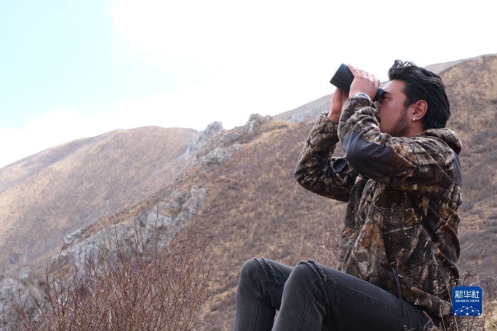 4月22日,生態(tài)管護員達杰用望遠鏡觀察對面山上的野生動物。新華社記者 央秀達珍 攝