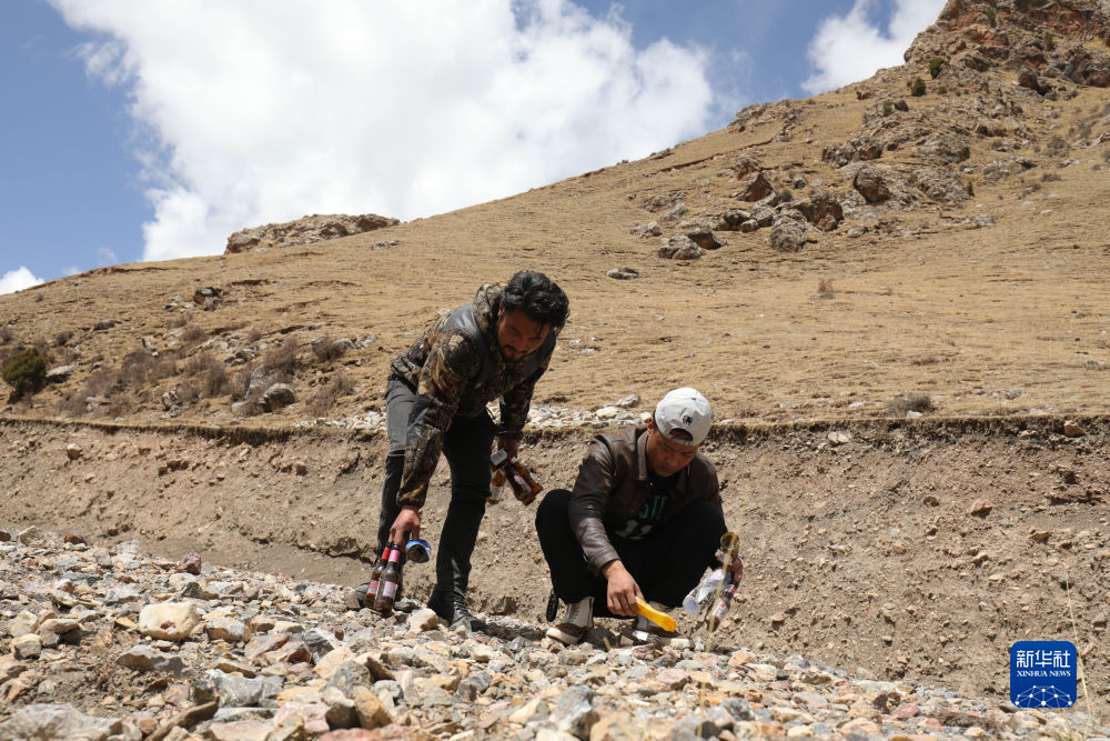4月22日,生態(tài)管護員達杰(左)和尕次在撿垃圾。新華社記者 央秀達珍 攝