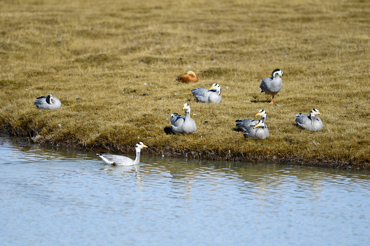 在三江源國家公園黃河源園區(qū)內拍攝的一群斑頭雁。新華社記者 李占軼 攝