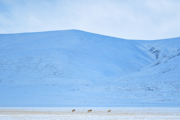 在三江源國家公園黃河源園區(qū)內拍攝的三匹狼。新華社記者 張龍 攝