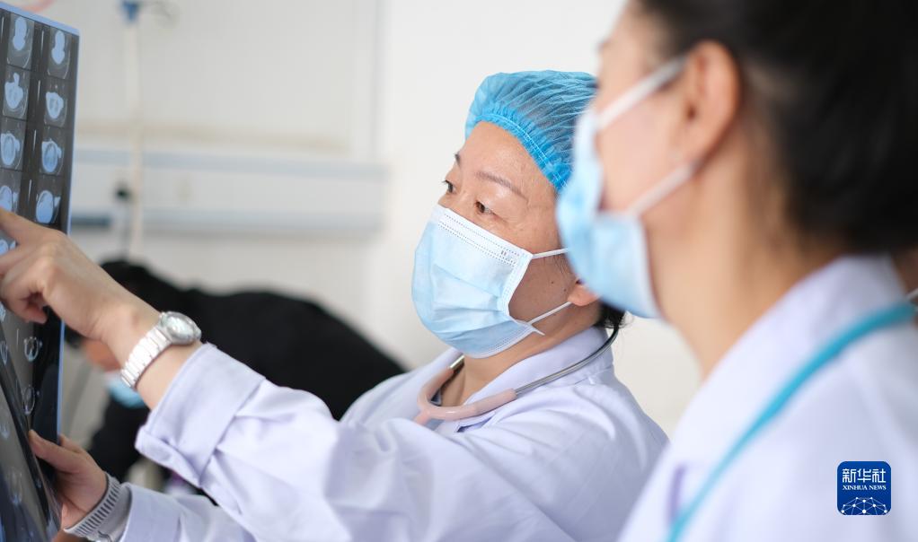 4月25日,青海省人民醫(yī)院醫(yī)生、青南支醫(yī)隊(duì)員祁永紅(左)給青海省玉樹藏族自治州人民醫(yī)院醫(yī)生普措然丁(右)講解頭顱磁共振成像操作。新華社記者 央秀達(dá)珍 攝
