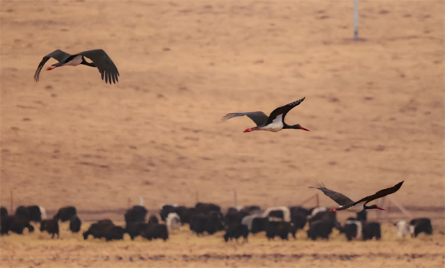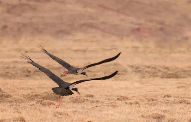 近日,有攝影師在祁連山國(guó)家公園亂海子濕地拍攝記錄到4只國(guó)家一級(jí)重點(diǎn)保護(hù)野生動(dòng)物——黑鸛,它們時(shí)而低頭覓食、時(shí)而展翅飛翔。黑鸛是一種體態(tài)優(yōu)美、體色鮮明、性情機(jī)警的大型涉禽,屬世界瀕危鳥類之一,在中國(guó)僅有1000多只,珍稀程度不亞于大熊貓,因此也有“鳥中大熊貓”之稱。